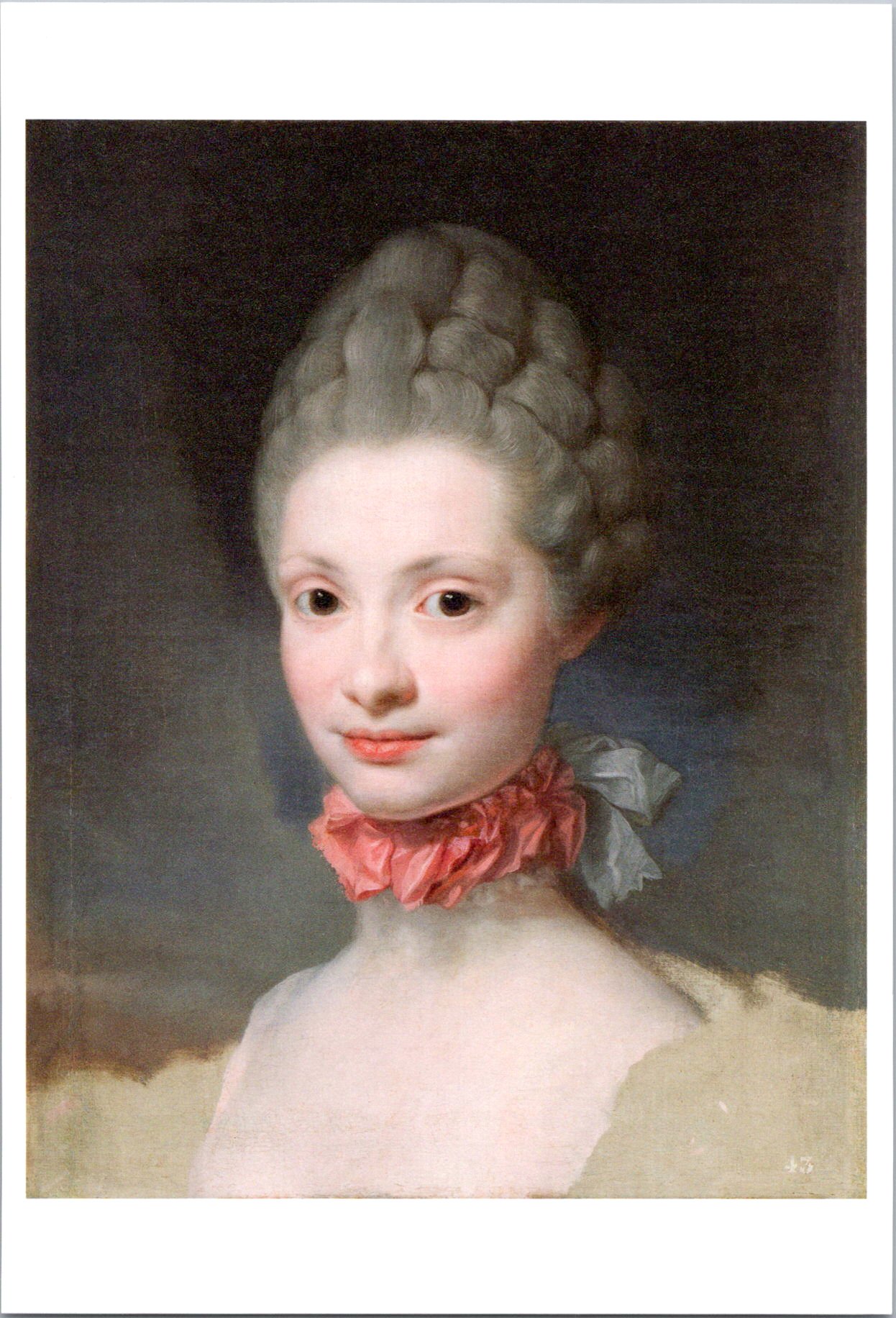 全体的な印象としては「白い」。当時の流行により、髪は髪粉をたっぷりとつけて白くなっているようです。肌も、おしろいがたっぷりとぬられています。15歳のみずみずしさは塗りこまれてしまっているかのようです。